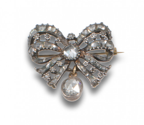 Broche S. XIX, realizado en plata. En forma de lazo cuajado de diamantes, talla holandesa y rosa