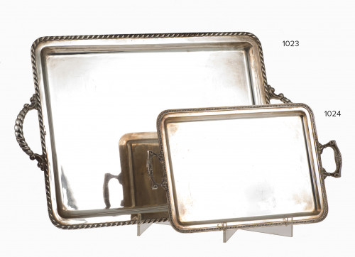 Bandeja en plata española ley 916. Greca de perlas al borde y asas laterales.