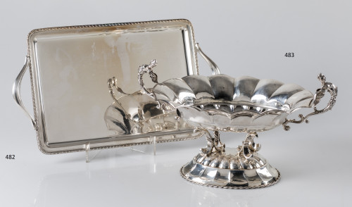 Bandeja con asas de plata de ley 916, España, S. XX. Alero con decoración de palmetas.