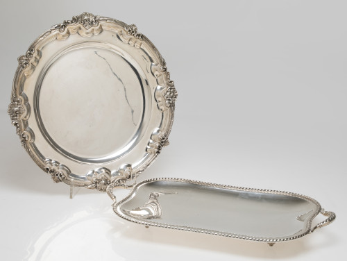 Bandeja con asas de plata española, Ley 916, S. XX. Asas y borde sogueado y patas gallonadas.