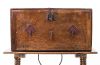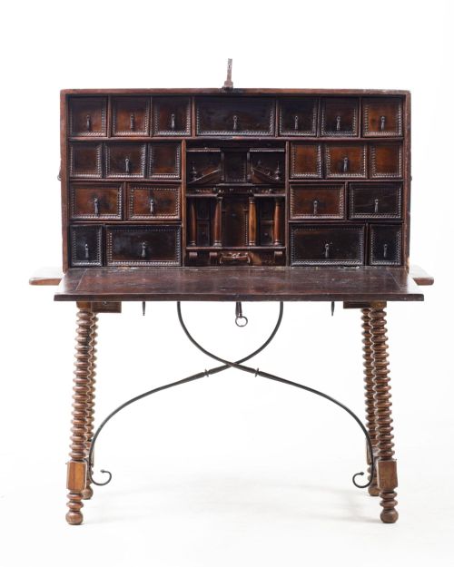 De nogal y herrajes de hierro. Interior con capilla central arquitectónica y gavetas con decoración uñeteada.