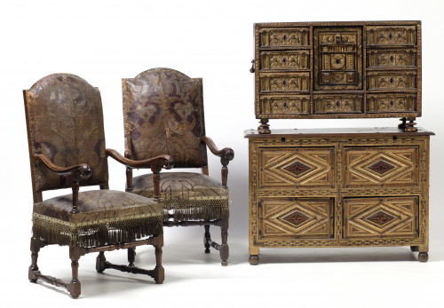 Siguiendo modelos barrocos del siglo XVII. De madera tallada y dorada con incrustaciones de hueso policromado y herrajes de hierro.