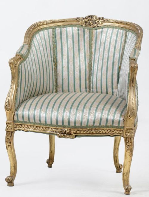 De madera tallada y dorada con respaldo rematado por guirnalda de flores.