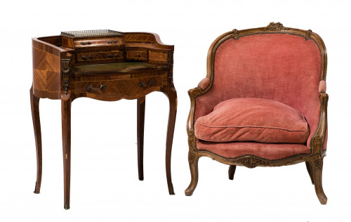 Bergere estilo Luis XV, med. S. XX. De haya tallada con respaldo rematado en flores y tapicería de terciopelo rosa. Precisa repaso de barniz.