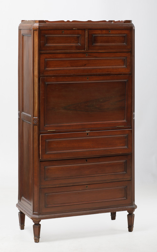 Buró"à abattant", S. XX. De madera teñida imitando caoba, con seis cajones en el frente e interior compartimentado. Faltas.