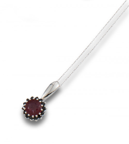 Cadena con colgante en oro blanco de 18 kt. con rubí, talla redonda, de aproximadamente 1.50 ct. y orla de espinelas negras, con un peso total aproximado de 0.35 ct.