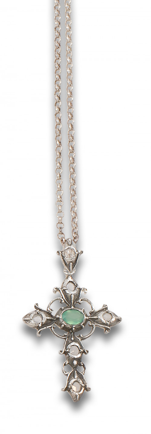 Cruz colgante, estilo antiguo, con cadena en plata con crisoprasa central, talla oval.