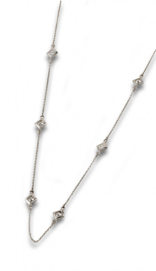 Cadenita de oro blanco de 18 kt. con diamantes salpicados, talla princesa, engastados en chatón.