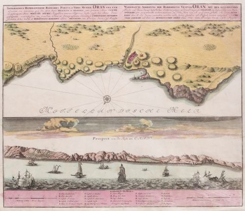"Plano y vista del puerto y ciudad de Orán y Perspectiva de su bahía"