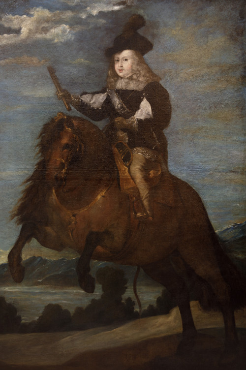 El espléndido lienzo que aquí se muestra, obra de algún autor cercano a Sebastián Herrera Barnuevo, tomó como fuente de inspiración la conocida obra de Velázquez pintada para el Salón del Rey del Palacio del Buen Retiro que representa a Baltasar Carlos a caballo. Es, entre todos los ejemplos conocidos, el que mejor asimila el modelo velazqueño, pues capta algunos de sus aspectos técnicos, reproduciendo también de manera similar el paisaje de fondo.