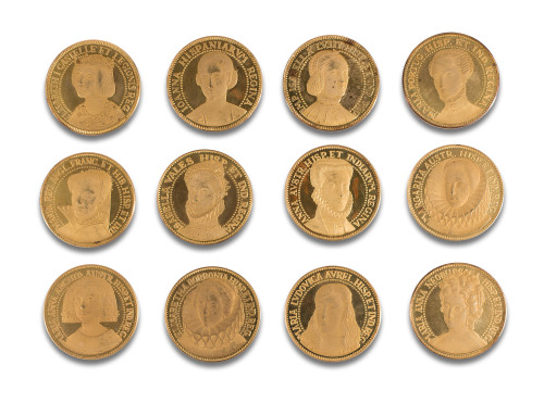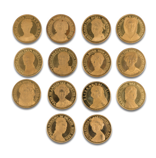 Colección de 26 medallas conmemorativas de las Reinas de España -de Isabel "La Católica" a Victoria Eugenia de Battenberg, a excepción de María Cristina de Habsburgo y Lorena- en oro amarillo de 22 kt.