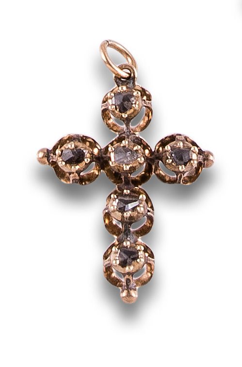Colgante cruz antigua de oro amarillo de 18 kt.. Brazos de diamantes, talla rosa, engaste en garras.