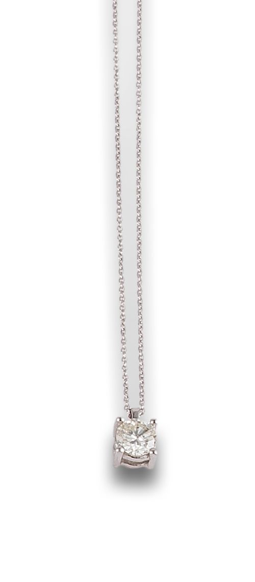 Colgante de oro blanco de 18 kt. Formado por un diamante, talla brillante, estimado en 0.35 ct., engastado en garras. Se acompaña de cadenita de oro blanco de 18 kt.
