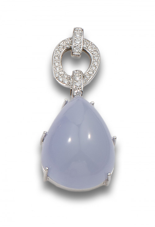 Colgante de oro blanco de 18 kt. Formado por aro cuajado de diamantes, talla brillante, peso total estimado de 0.55 ct. engastados en grano, del que pende un cabujón perilla de calcedonita.