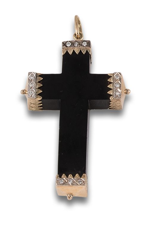 Cruz colgante de azabache con remates de oro amarillo de 18 kt. con hileras de diamantes.