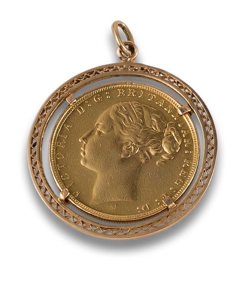 Colgante con reproducción de soberano británico en oro de 1879 en orla de oro amarillo de 18 kt. Peso: 21,20 Gr..