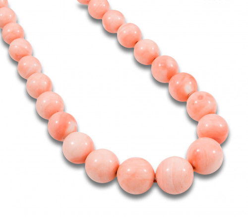 Collar extra largo de cuentas de coral piel de ángel dispuestas en degradé, calibradas entre 9 mm y 29 mm.