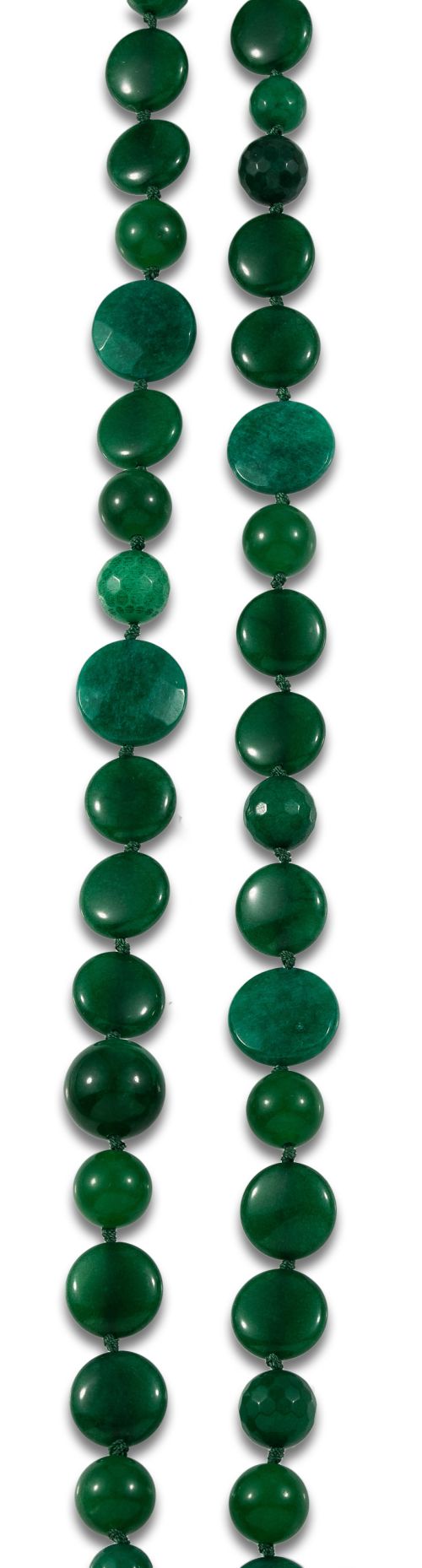 Collar largo de cuentas circulares, facetadas y tipo botón de aventurina verde. Cierre de hilo con botón de nácar.