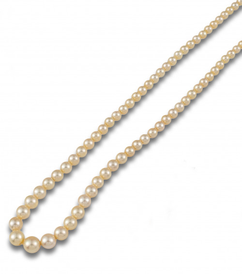 Collar de perlas cultivadas en degradé, de 8 a 4 mm. de diámetro. Cierre oro blanco de 18 kt. con centro de brillante, talla brillante.