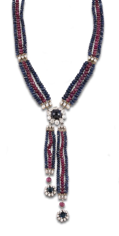Gargantilla en oro blanco de 18 kt. con hileras de zafiros y rubíes facetados unidos por barettes de diamantes, y rosetón central con un peso total aproximado de 2.50 ct, enmarcando cabujón de zafio estimado en 4.50 ct. y dos pendentif rematados en rosetón de diamantes y zafiros con un peso total estimado de 2.00 ct. Cierre chevalier en platino con diamantes y rubíes calibrados.