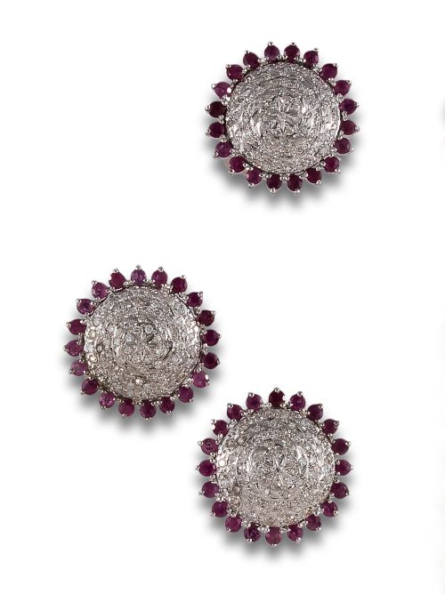 Conjunto de sortija y pendientes en oro blanco de 18 kt. con frentes cuajado de diamantes, con un peso total estimado de 1.50 ct. orlados por rubíes.