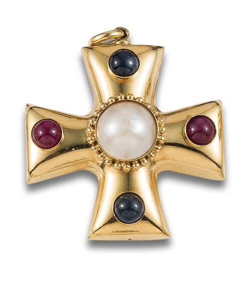 Cruz colgante de oro amarillo de 18 kt. Centro de perla mabé calibrada en 14 mm. de diámetro engastada en chatón con coroncillo y cabujones de zafiros y rubíes, engastados en chatón.Peso: 23,40 Gr..