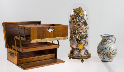 De roble y latón dorado. Con tres bandejas desplegables en el interior, la primera con números grabados. Precisa repaso de barniz y ajuste en el cierre.