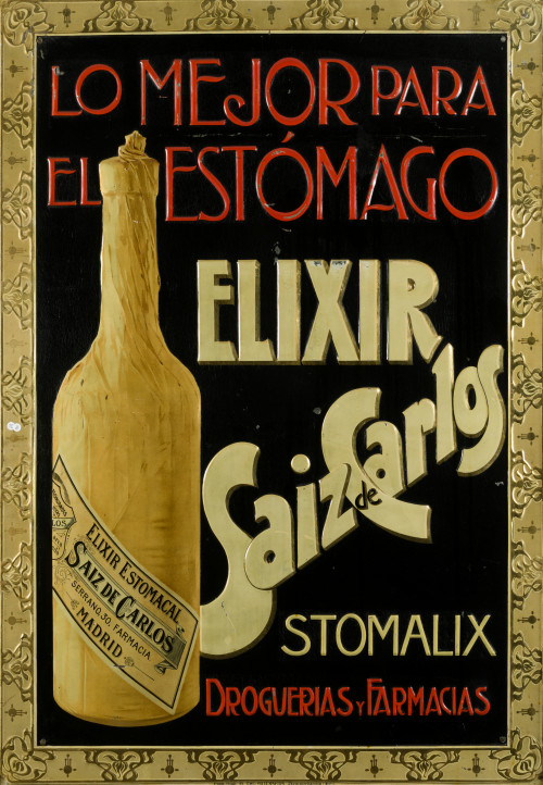 Cartel publicitario "Elixir Saiz de Carlos" realuzado en metal en relieve policromado. Se presenta enmarcado