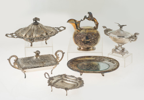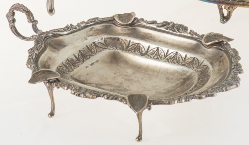 Con asa y cuatro patas, con alero decorado con motivos vegetales.