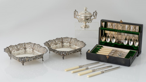 Centrito on tapa en plata españo.a. Asas laterales caladas e iniciales grabadas.