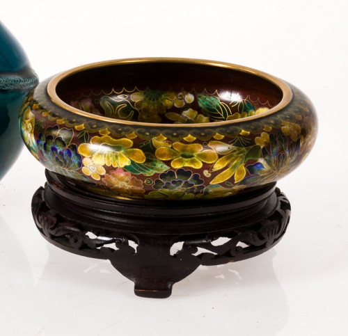 Centro de esmalte cloisonne China, S.XX. Con decoración de flores sobre base de madera.