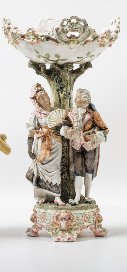 Centro de mesa de loza esmaltada, España, S. XX. Con pareja galante en el fuste y decoración de veneras y flores.