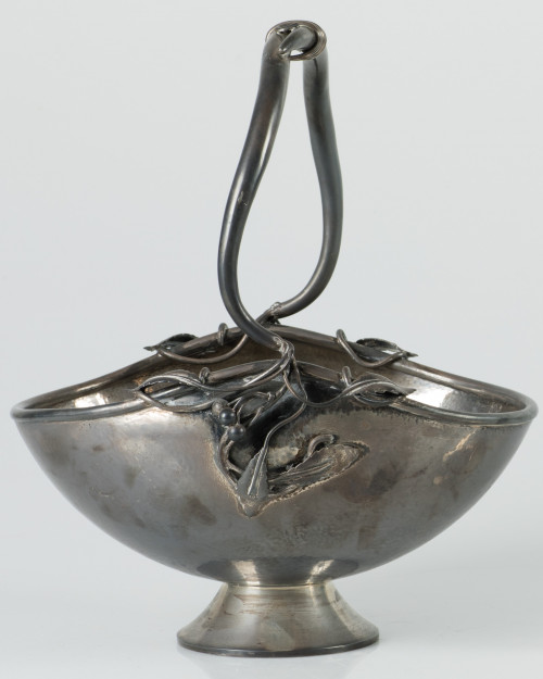 Centro de mesa en forma de cesto martelé de plata española contrastada, ley 916. Asa con decoración de hojas y frutas aplicadas.