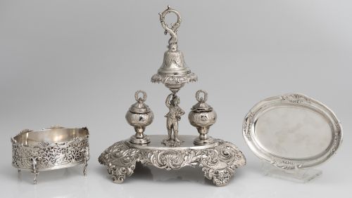 Centro en plata Sterling inglesa, con marcas de  Sheffield año 1898. Perfil oval con decoración calada de entrelazos vegetales. Cuatro pies de cabeza de carnero.