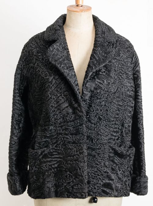 Chaqueta corta de piel de astracán color negro, ajustable en la cintura y cierres de gancho. Forro estampado en print de animal. Talla mediana