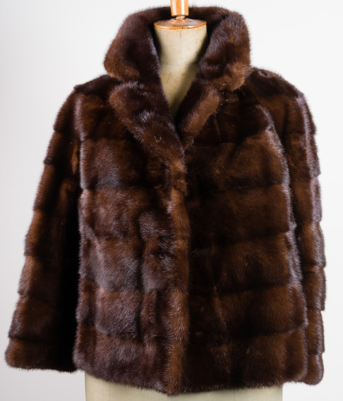 Chaqueta de lomos de visón marrón dispuestos en horizontal. Cierre de enganche e interior forrado en tela. Talla S/M.