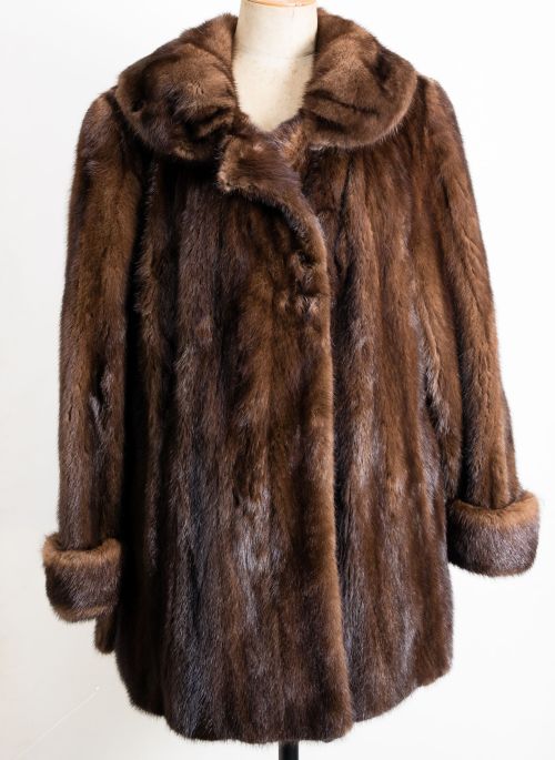 Chaquetón de lomos de visón color marrón con cierre de botón y ganchos. Talla mediana