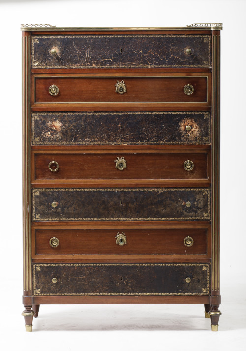 Chiffonier de estilo Luis XVI, Herráiz, med. S. XX. De caoba, cuero gofrado, latón dorado y tapa de mármol color crema. Estampillado. Faltas.