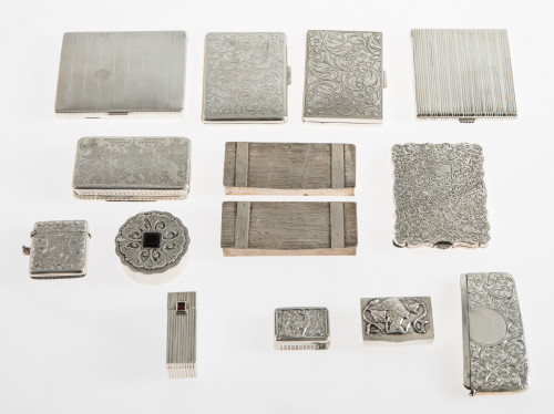 Lote de plata compuesto por 13 piezas: pitilleras, pastilleros, tarjeteros... con diferentes marcas y decoraciones, S.XIX y XX. Se adjunta una tapa suelta en plata inglesa que no corresponde.