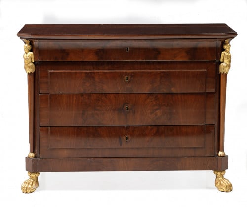 Cómoda de estilo Imperio, pp. S. XX en madera de caoba, patas de garra y cariátides de madera tallada y sobredorada.