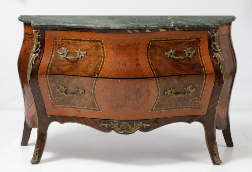 Cómoda bombé de estilo Luis XV de dos cajones con decoración de marquetería aplicaciones de metal dorado y tapa de mármol verde. Faltas en la marquetería. 91 x 145 x 57 cm.