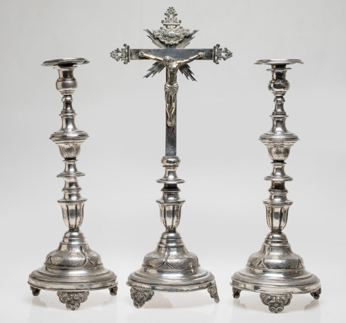 Conjunto de altar en plata española en su color, con marcas de Córdoba año 1856, Rafael Martos Martos y J. Heredia.