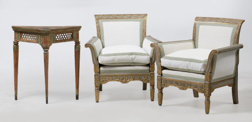 Consola de arrimo, España, S. XVIII y posterior. De pino tallado, calado y policromado de gusto Neoclásico.