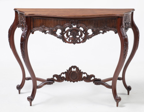 Consola de estilo Luis XV, en madera de caoba. mediados SXX. Madera teñida imitando caoba con cintura calada. Medidas: 90 x 130 x 54 cm.