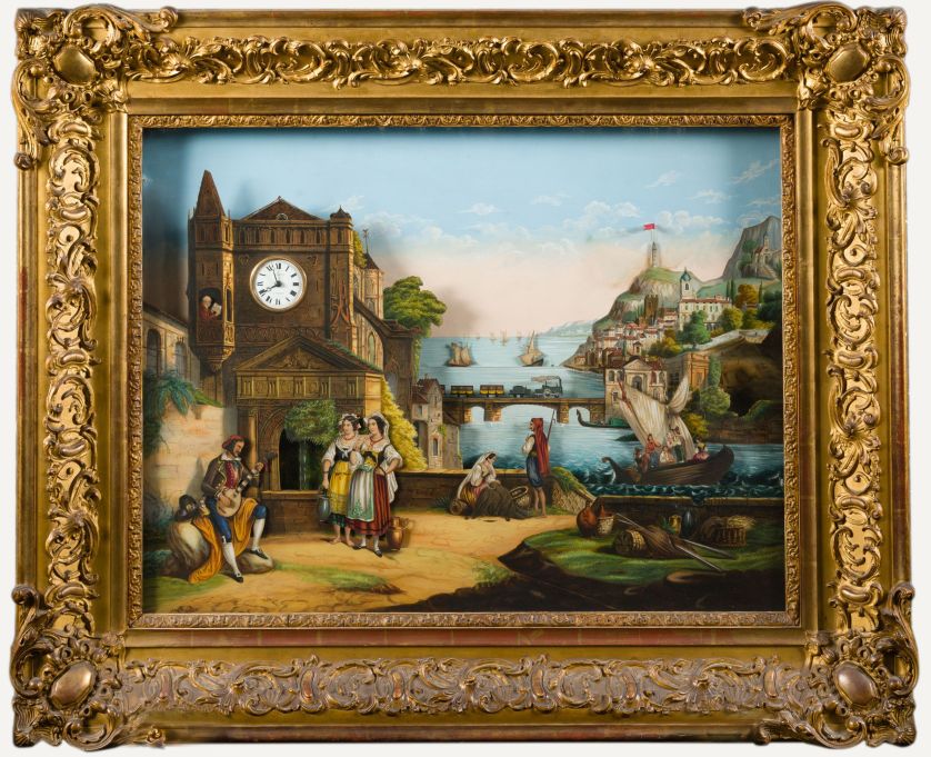 Cuadro-reloj autómata Francia c.1860 representando un pueblo costero italiano con personajes. Realizadado en papel-cartón litografiao con decoración policromada al gouache. Esfera del reloj firmada Tharin, Paris (Xavier Tharin), con sonería y movimiento, necesita repaso. Se adjunta llave