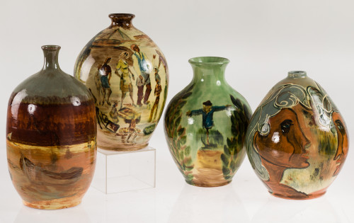 Cuatro jarrones de cerámica de La Bisbal d´Empordá, Cataluña, S. XX. De cerámica vidriada y esmaltada en colores tierra y verde. Decoración con escenas figurativas.
