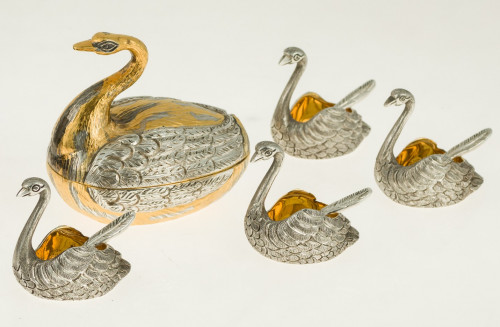 Cuatro saleros y un mostacero de plata y plata vermeille, joyería Tane, Méjico, S.XX