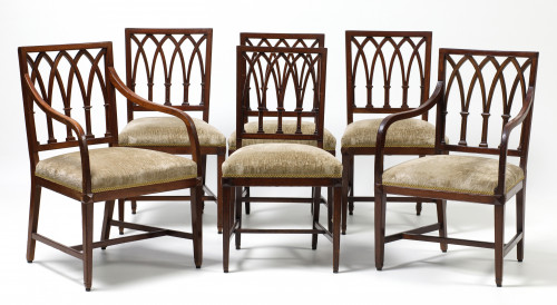 Cuatro sillas y dos butacas de estilo Sheranton, med. S.XX