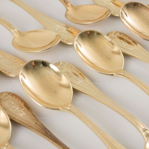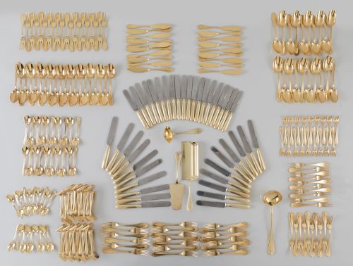 Compuesto por: 20 cucharas de mesa, 20 tenedores de mesa, 20 cuchillos de mesa, 20 tenedores de pescado (uno de ellos con una punta un poco doblada), 19 palas de pescado, 20 cucharas de postre, 20 cuchillos de postre, 20 tenedores de postre, 18 tenedores para ostras, 20 cucharas de helado, 19 cucharas café, 20 pinzas para espárragos, recogemigas, cazo de sopa, cazo de salsera y pala de postre.