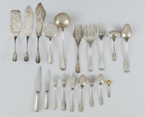 Cubertería de plata española, Ley 916, marcas de Matilde Espuñes, S. XX. Con decoración de veneras en los remates. Consta de: 11 tenedores, 12 cuchillos y 12 cucharas de mesa, 12 tenedores y 12 palas de pescado, 12 tenedores, 12 cuchillos y 12 cucharas de postre, 10 cubiertos para servir, dos de ellos asociados y 10 cucharillas de café de plata española con distinta decoración (iniciales "AV").